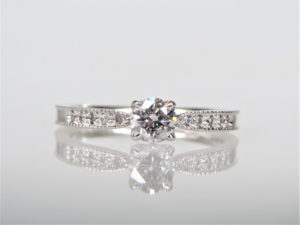 メレダイヤの両脇のミル打ち(アンティーク調の点々)と、真ん中にいくに従ってリングの腕が絞ってあるのが上品さと繊細さを出していて素敵です。