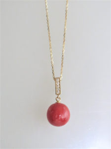すっきりとした直線にメレダイヤが5石入ったバチカンの下にサンゴが揺れるデザインです。