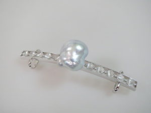 変わったバロックの白蝶真珠を活かした帯留めです。