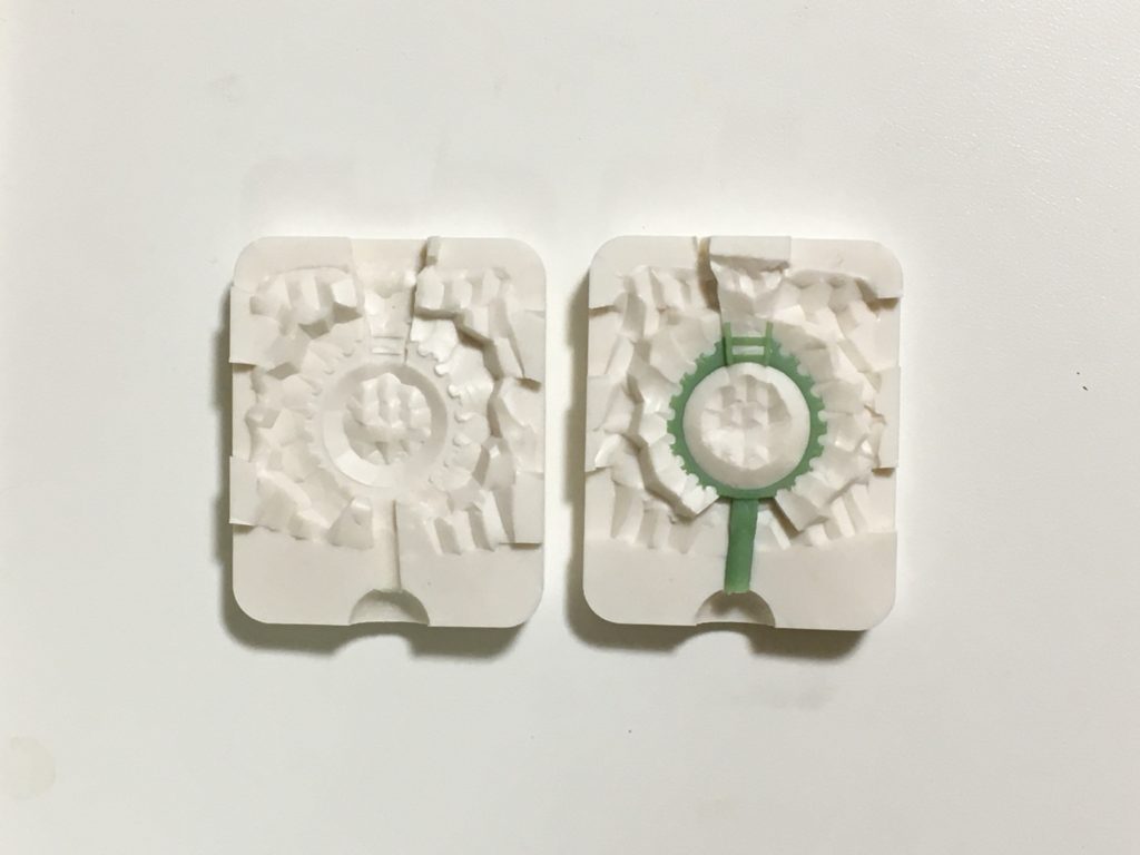 ここに流し込んだ緑のワックスを使って鋳造(キャスト)をしてプラチナにします。