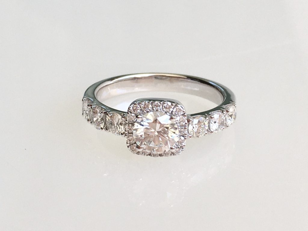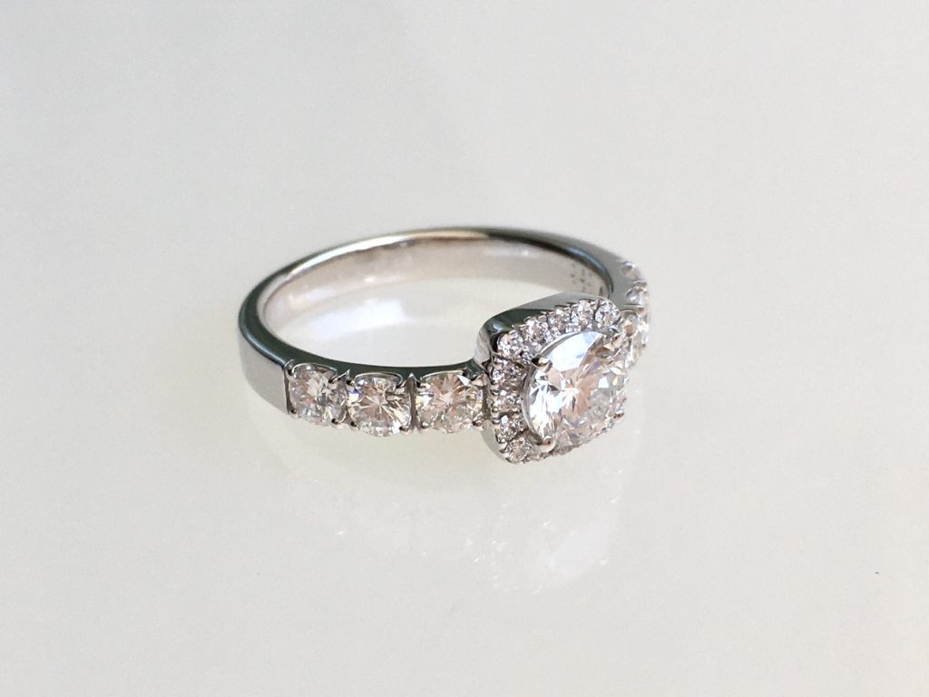 丸いダイヤを丸く取り巻くのはよくあるのですが、四角く取り巻くのはあまり多くありません。