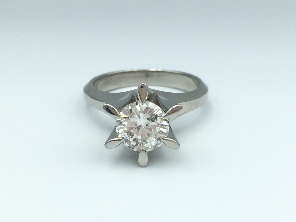 丸いダイヤの場合は既成の枠に入れてのリフォームも多いですが、今回はダイヤが1.3ct程でしたので既成の枠がなく、具体的なご希望の形もありましたのでオーダーメイドでお作りさせていただくことになりました。