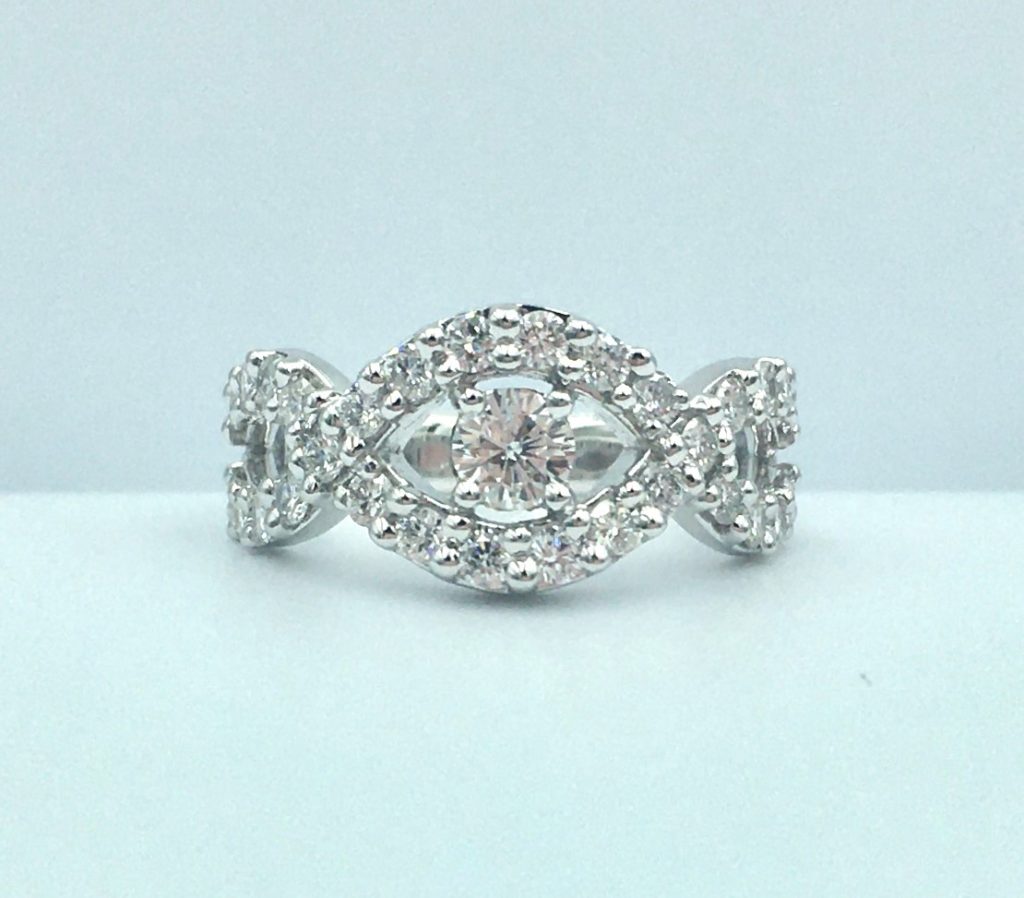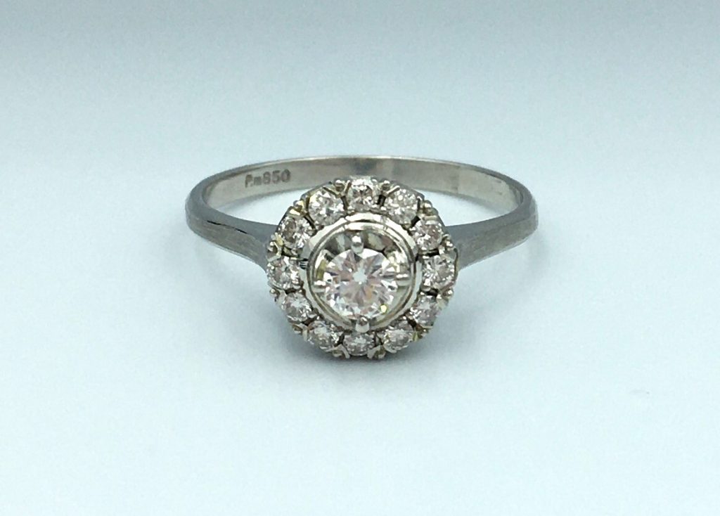 真ん中に1石ダイヤがあり、周りを小さなダイヤで取り巻いたデザインです。