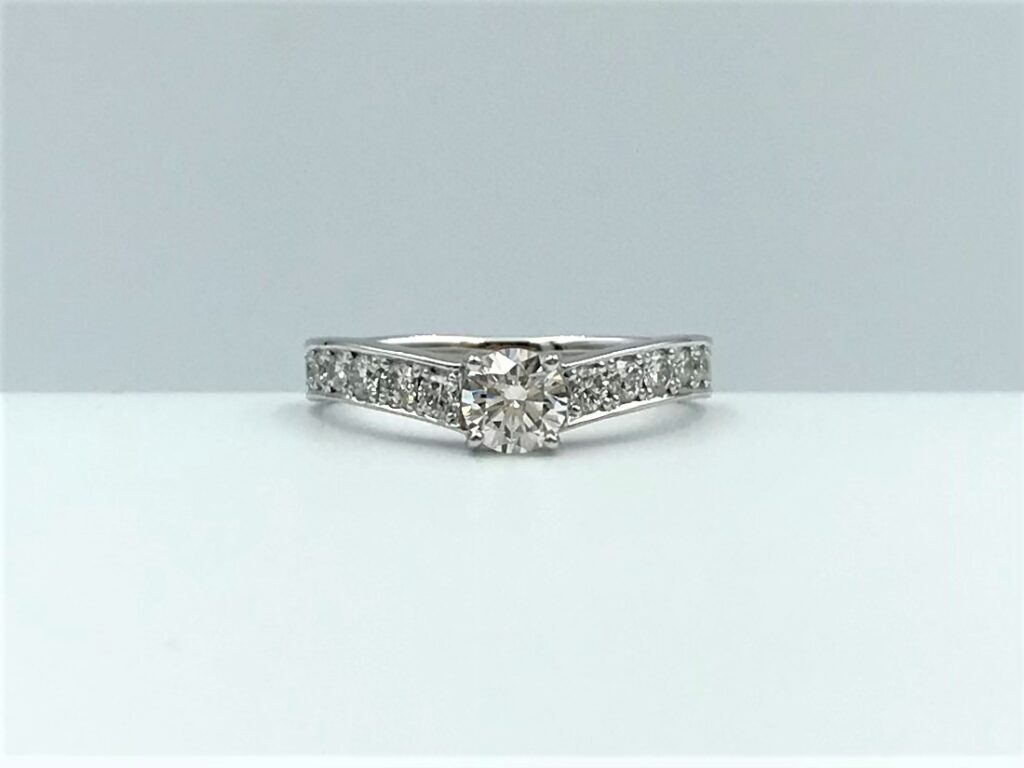 少しだけV字になったデザインで、小さいダイヤが両側に並んでいます。