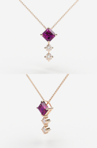 四角いガーネットのほうは縦ラインのペンダントに、丸いトルマリンは横並びのネックレス(3つのデザインのうち一番上のもの)でお作りすることになりました。