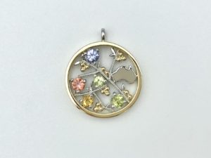 ご家族でオーストラリアに住まわれていた頃の思い出として、思い出のあるレインボー・ロリキート(カラフルなオーストラリアの野鳥)やオーストラリアの国花であるゴールデンワトルなどオーストラリアのモチーフをちりばめてオーダーメイドでお作りしたペンダントです。