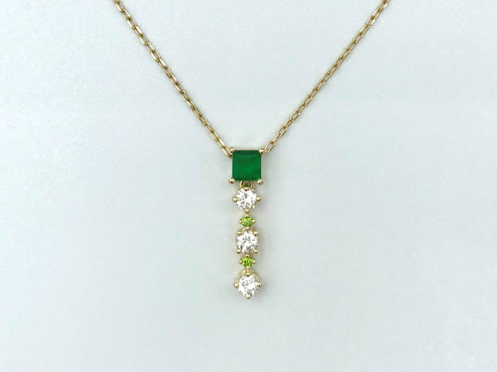 お持ちのエメラルドとダイヤを使って縦ラインのネックレスをお作りしました。