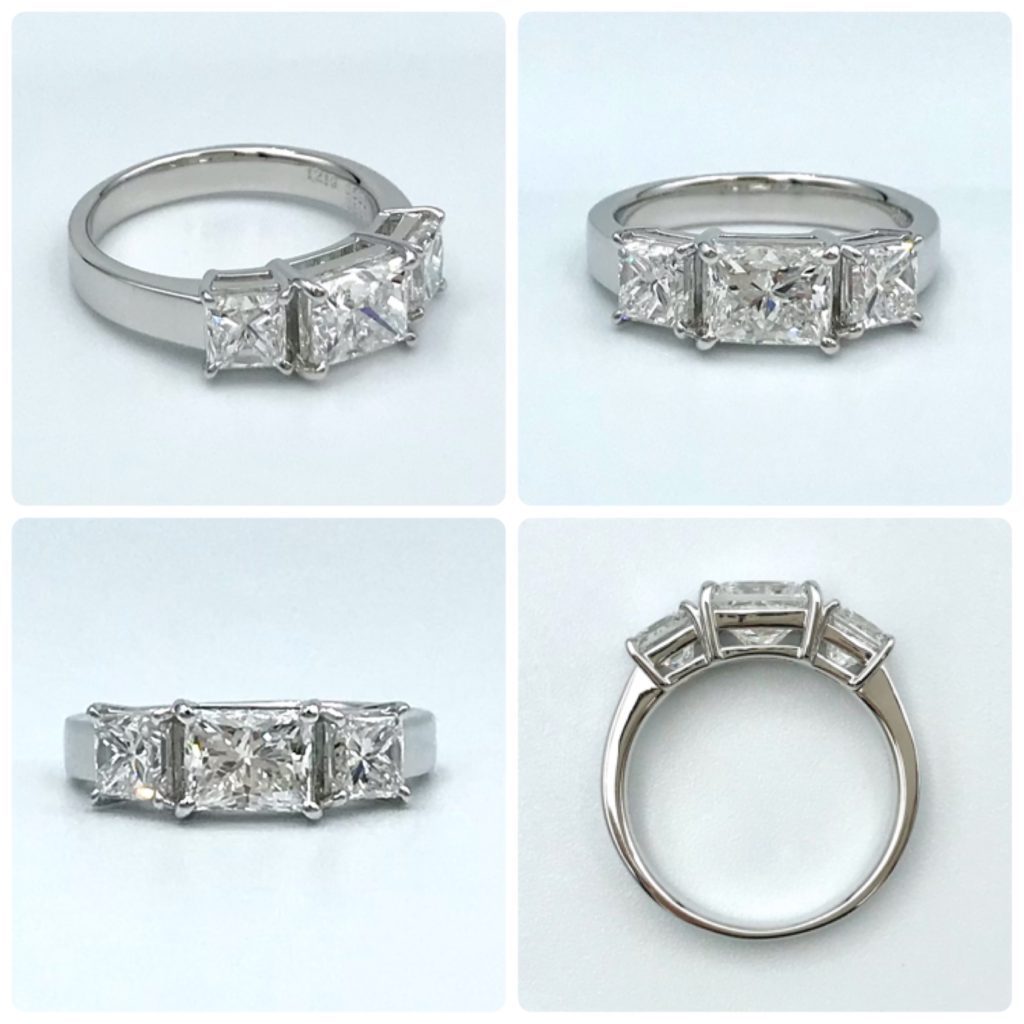 プリンセスカットのダイヤが美しく、ダイヤを活かすため高級感のあるシンプルなリングに仕上げています。