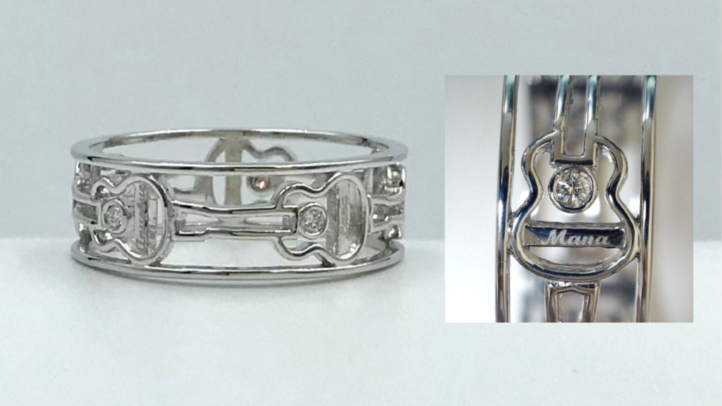 K様の趣味であるウクレレをモチーフにリングをデザインしてほしいとのご要望でお作りした指輪です。
