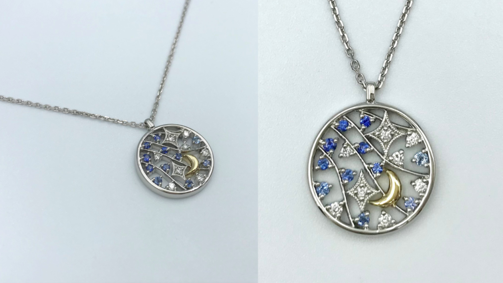 青い石がお好きとのことで、サファイアの濃淡を使って流れるような夜空をイメージし、そこに星と月が浮かんでいます。