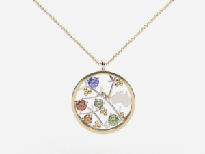 ご家族でオーストラリアに住まわれていた頃の思い出として、思い出のあるレインボー・ロリキート(カラフルなオーストラリアの野鳥)やオーストラリアの国花であるゴールデンワトルなどオーストラリアのモチーフをちりばめてオーダーメイドでお作りしたペンダントです。