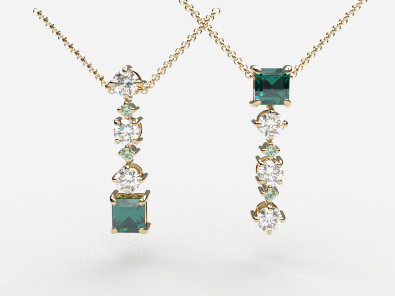 お持ちのエメラルドとダイヤを使って縦ラインのネックレスをお作りしました。